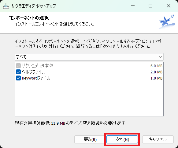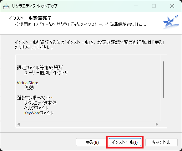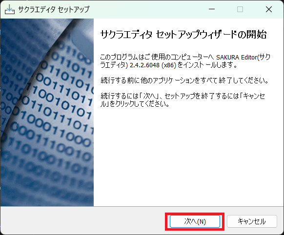 ダウンロードした ZIP ファイルを解凍し、フォルダ内の「sakura_install_x-x-x-xxxx-x86.exe」 をダブルクリックしてインストーラーを起動します。