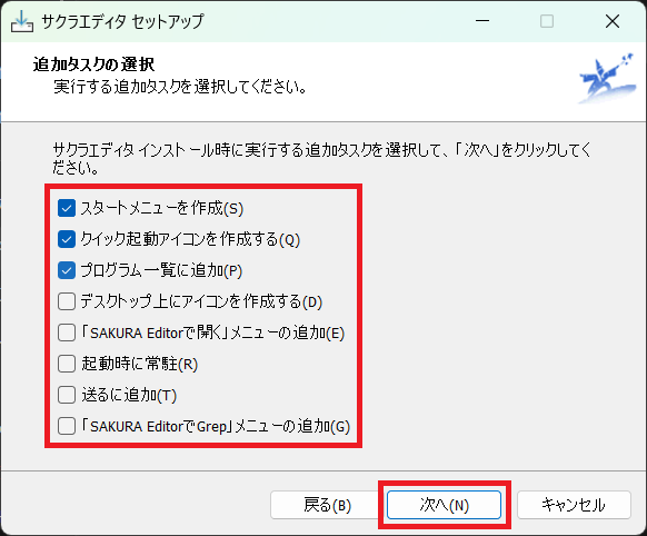 必要に応じてチェックを入れ、「次へ」をクリックします。