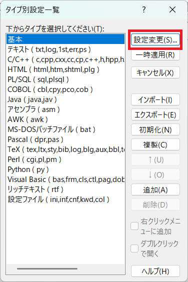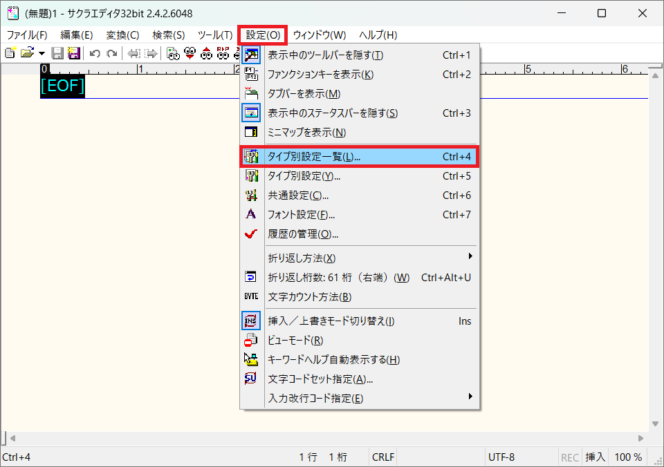 サクラエディタ画面のうち上部メニューの「設定」から「タイプ別設定一覧」を開きます。